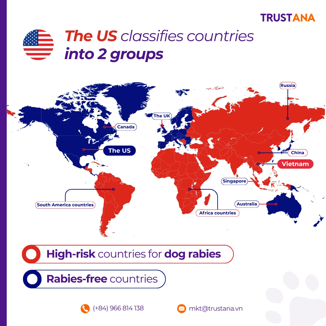 🔴 High Rabies-Risk Countries: Vietnam, China, India, Brazil, Russia, Thailand, etc.